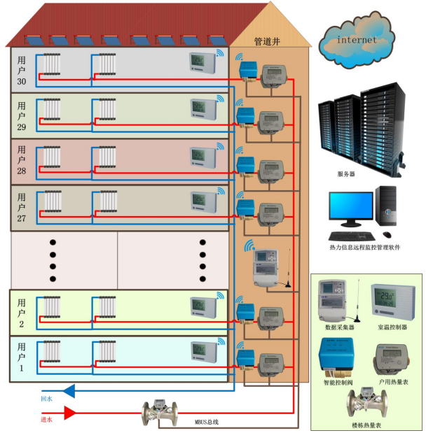 ?、硵?shù)據(jù)采集層:由采集計(jì)算器、智能控制閥、室溫控制器、熱量表組成。室溫控制器安裝在室內(nèi)用來(lái)采集室內(nèi)的溫 度,與智能控制閥以無(wú)線(xiàn)方式進(jìn)行通訊。智能控制閥安裝在管道井,與采集計(jì)算器以有線(xiàn)或無(wú)線(xiàn)方式進(jìn)行通訊,采 集計(jì)算器采集智能控制閥、室溫控制器和熱量表數(shù)據(jù)并進(jìn)行熱量分?jǐn)偂?/p>